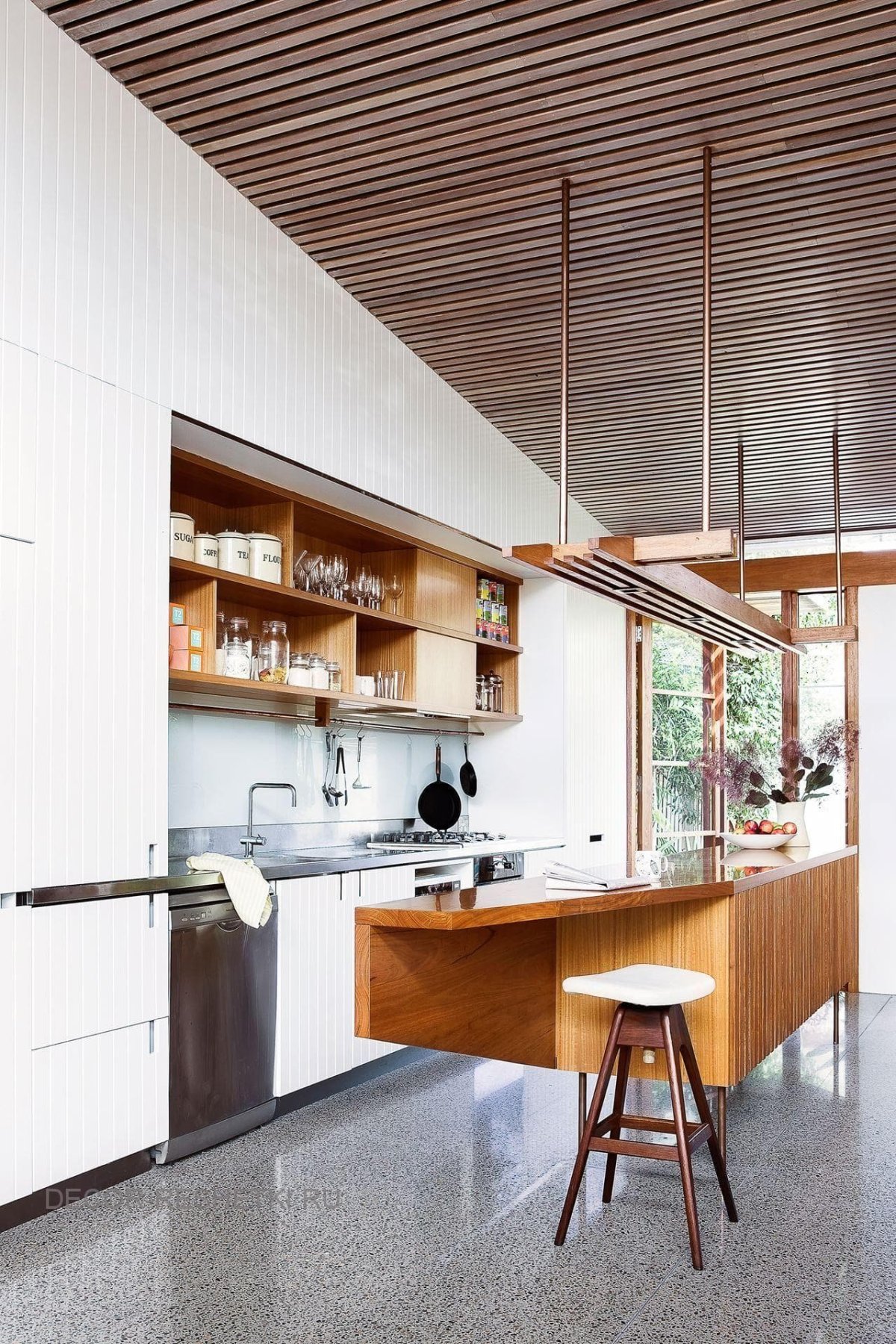 Фото: Деревянные рейки в интерьере на стене на кухне