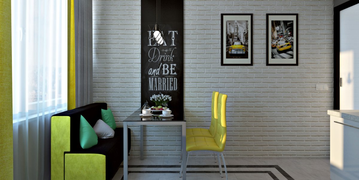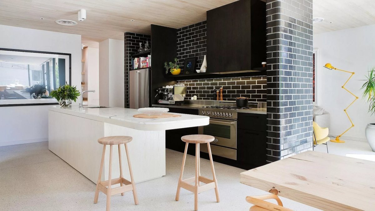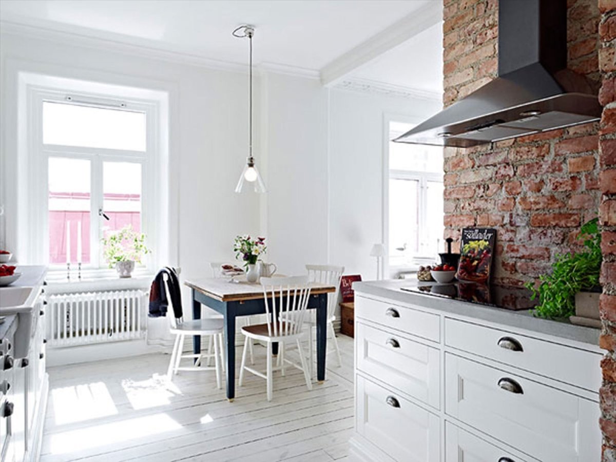 2. Интерьер кухни с кирпичной стеной в сочетании с обоями