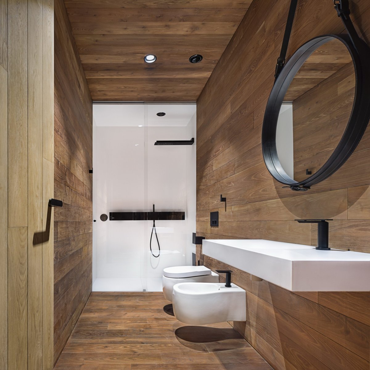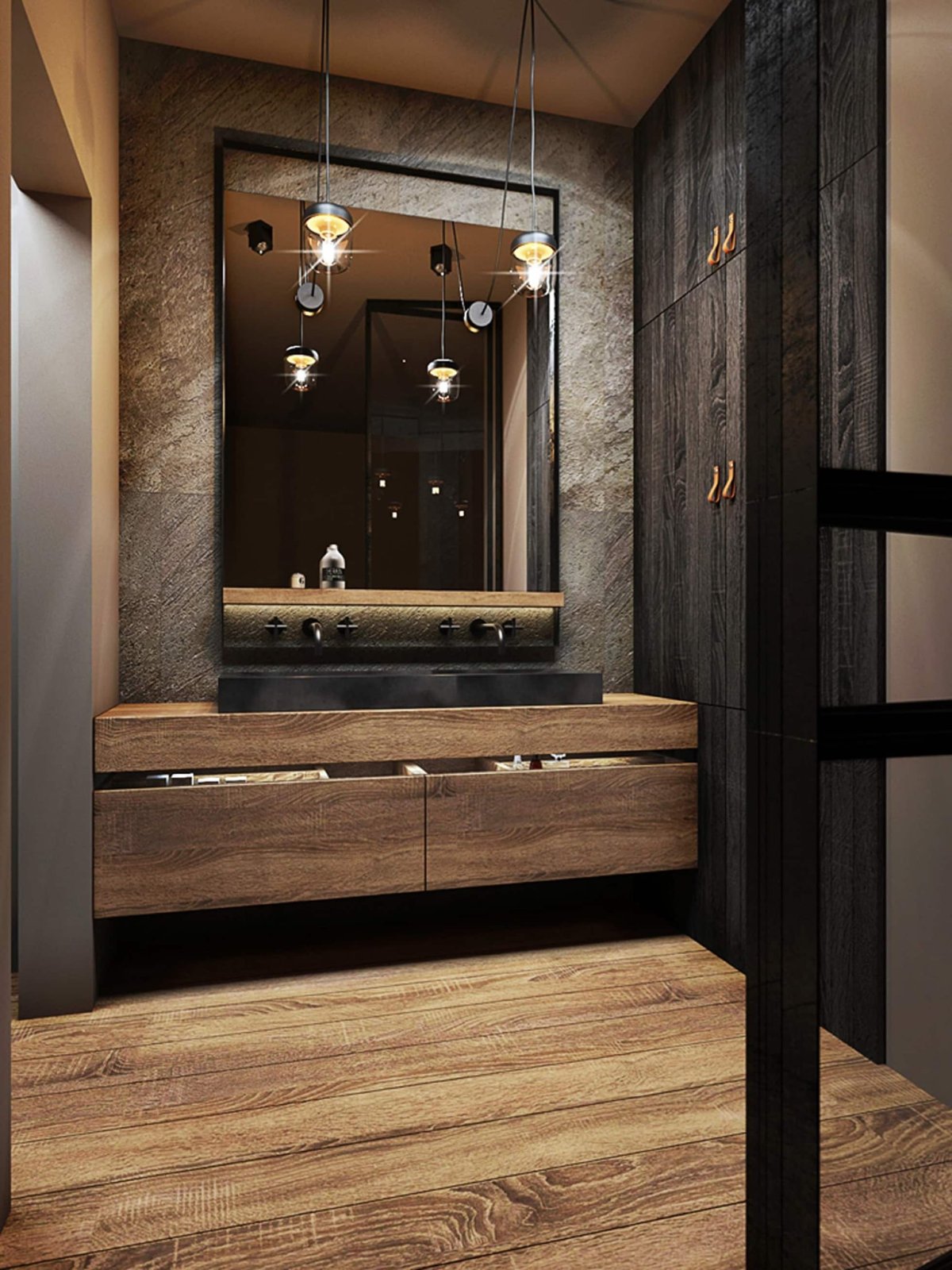 Приглашаем вас взглянуть на фото ниже, чтобы оценить всю красоту и элегантность этого уникального тёмного санузла с деревянными элементами.