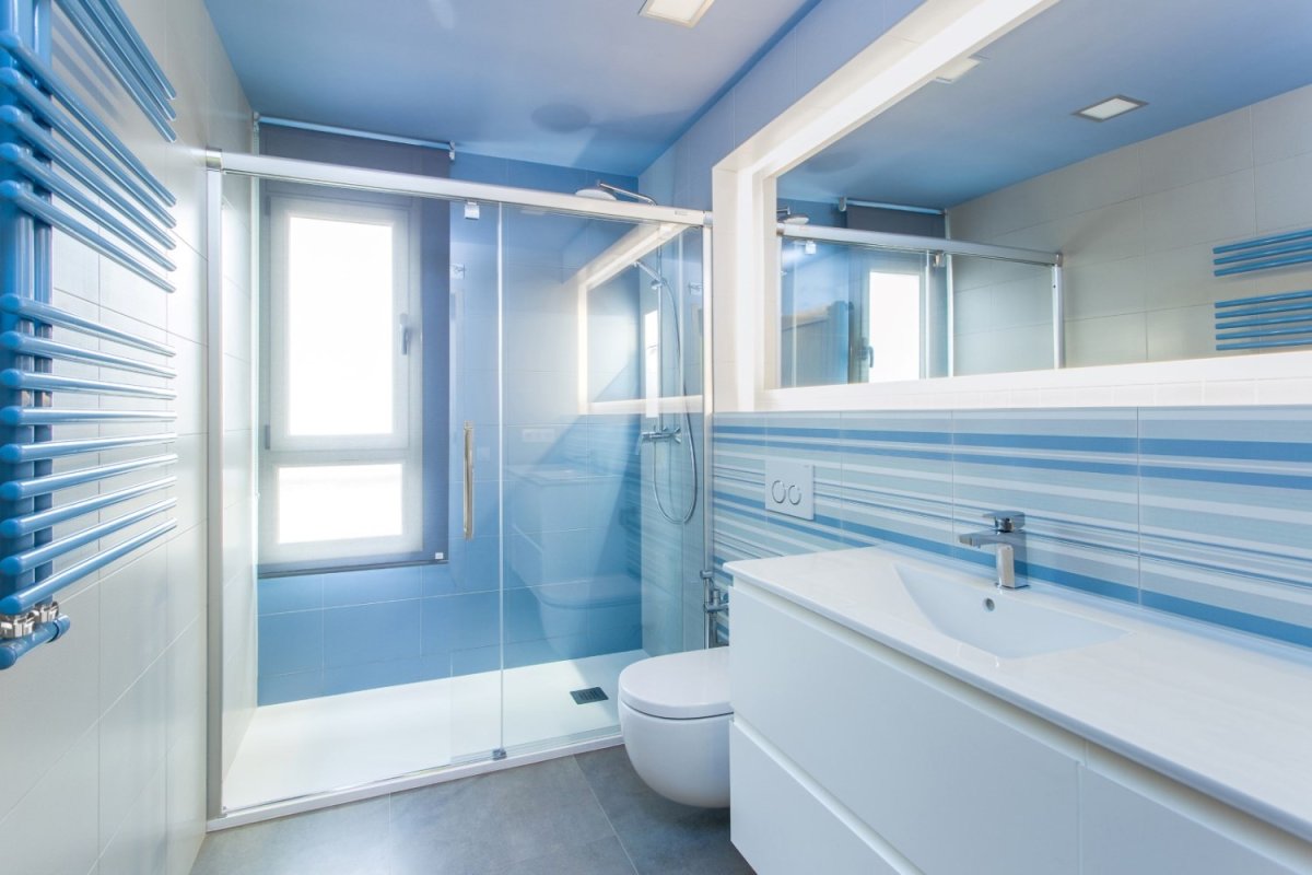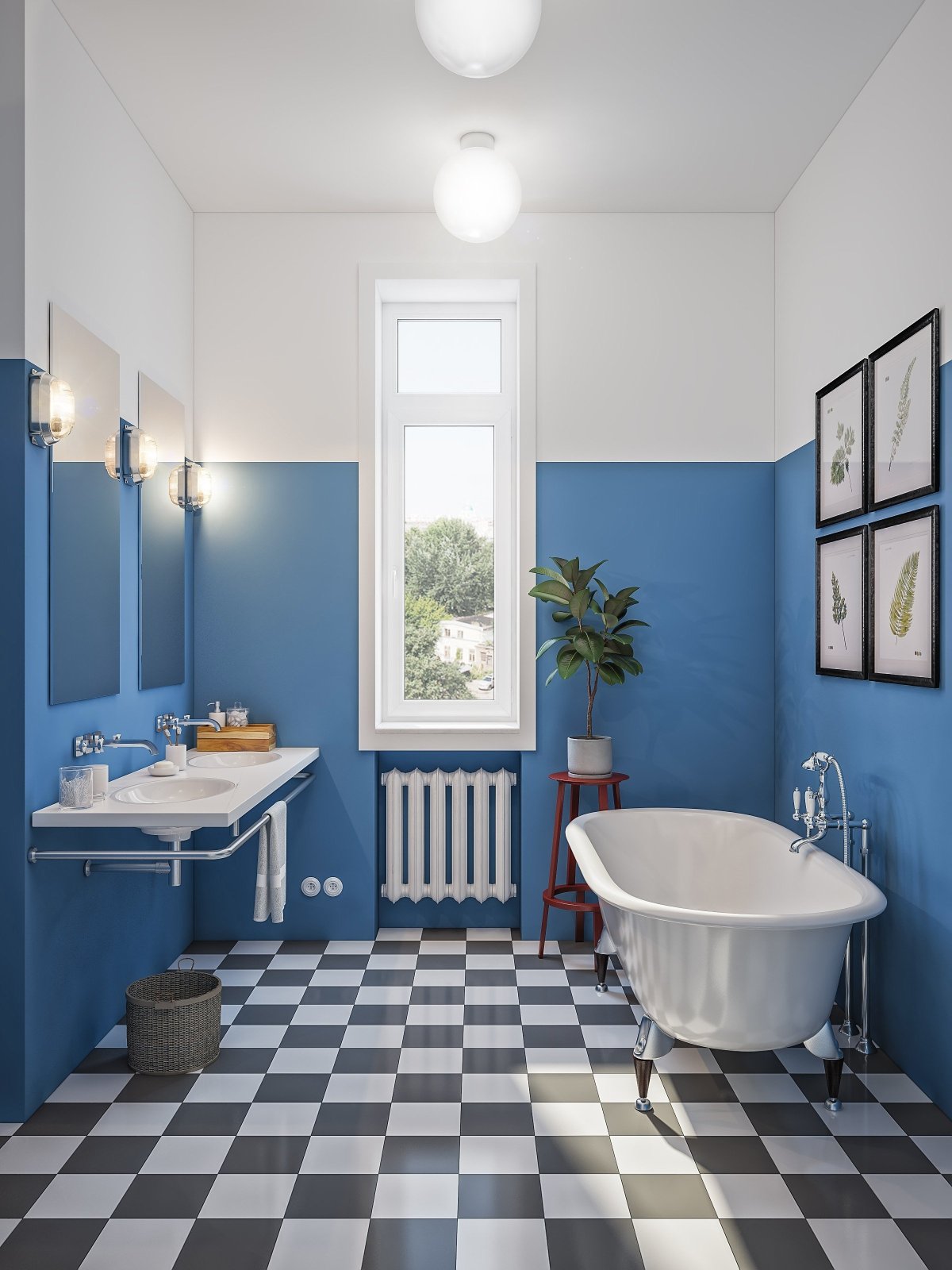 34. Синяя плитка в ванной комнате в скандинавском стиле