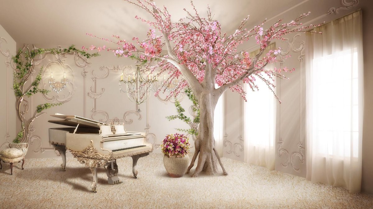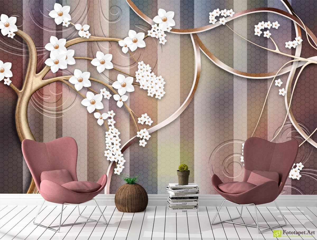 26. Фотообои дерево с белыми цветами в интерьере