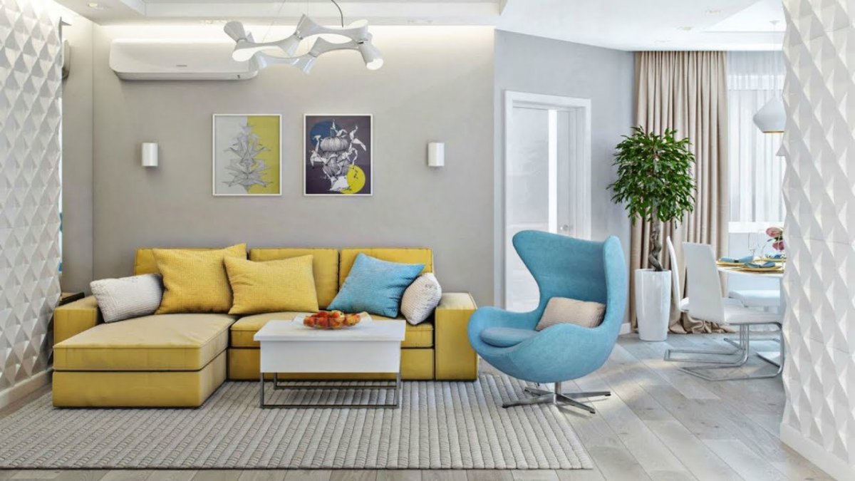 48. Интерьер гостиной желтый диван бирюзовый