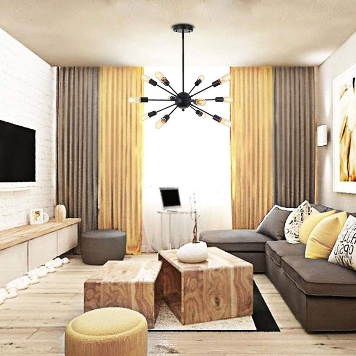 33. Желтые шторы в сером интерьере гостиной