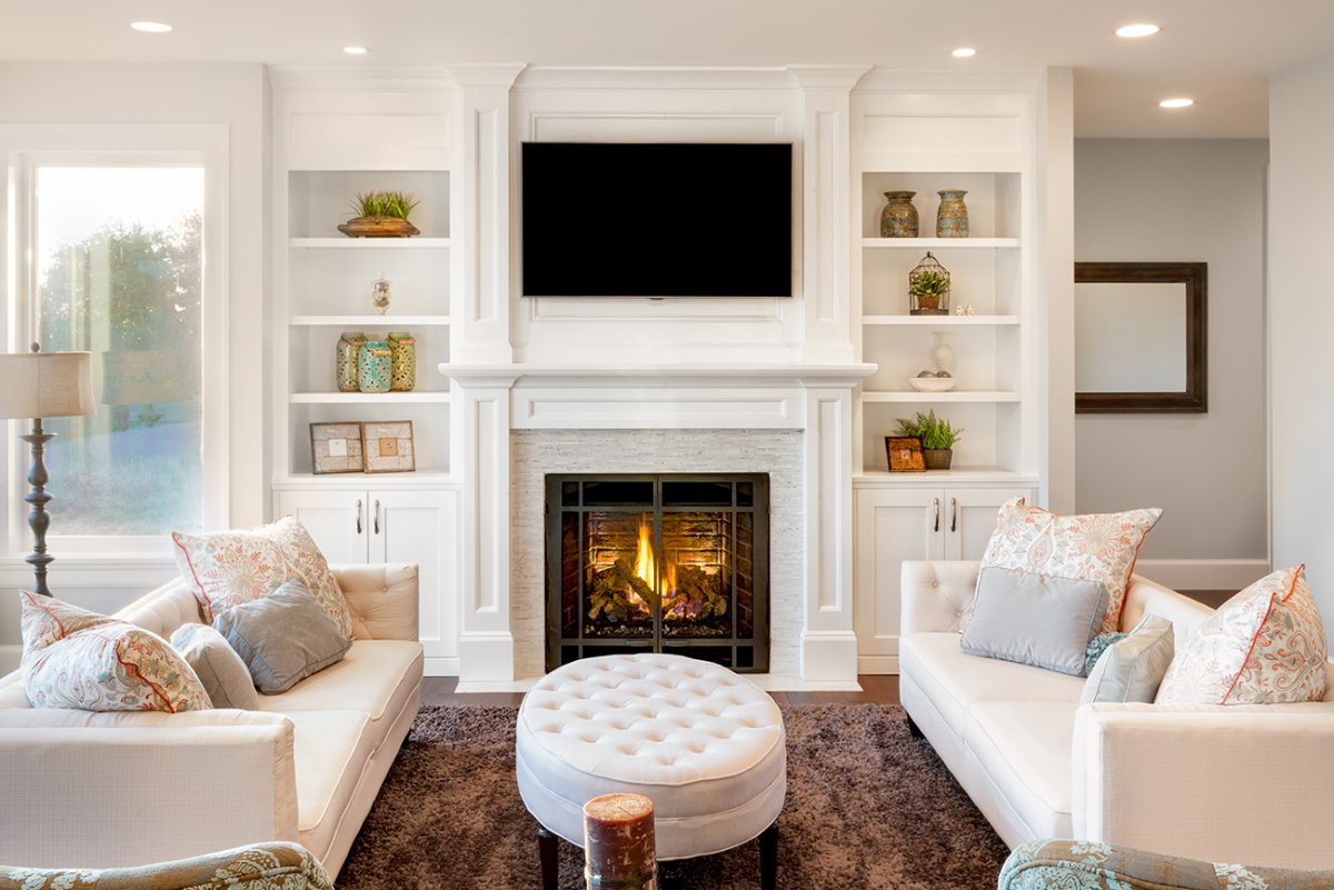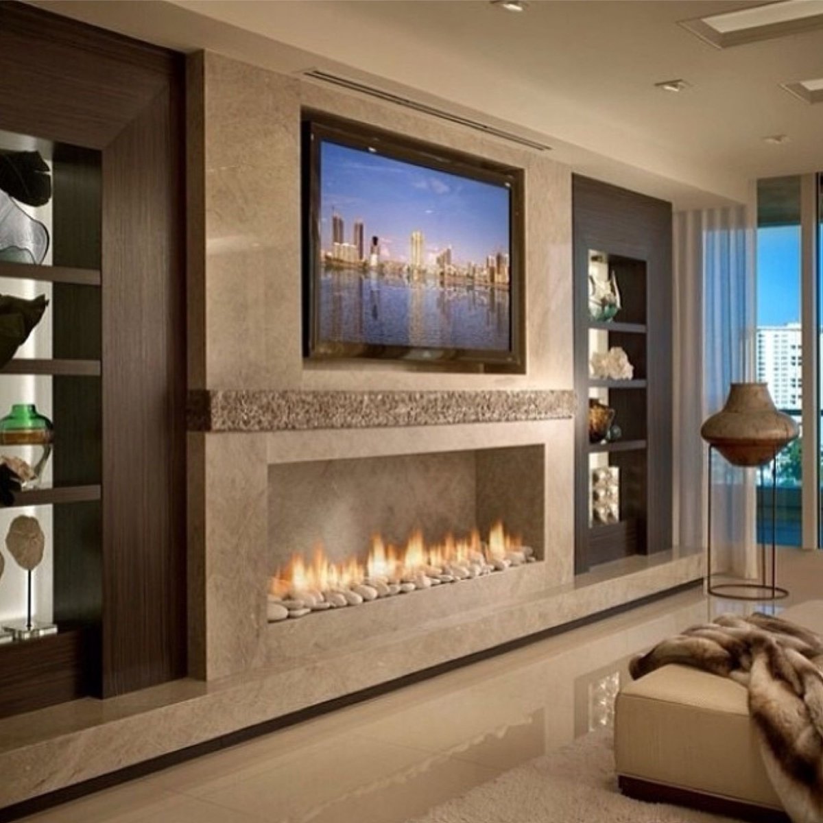 36. Камин и телевизор в интерьере гостиной