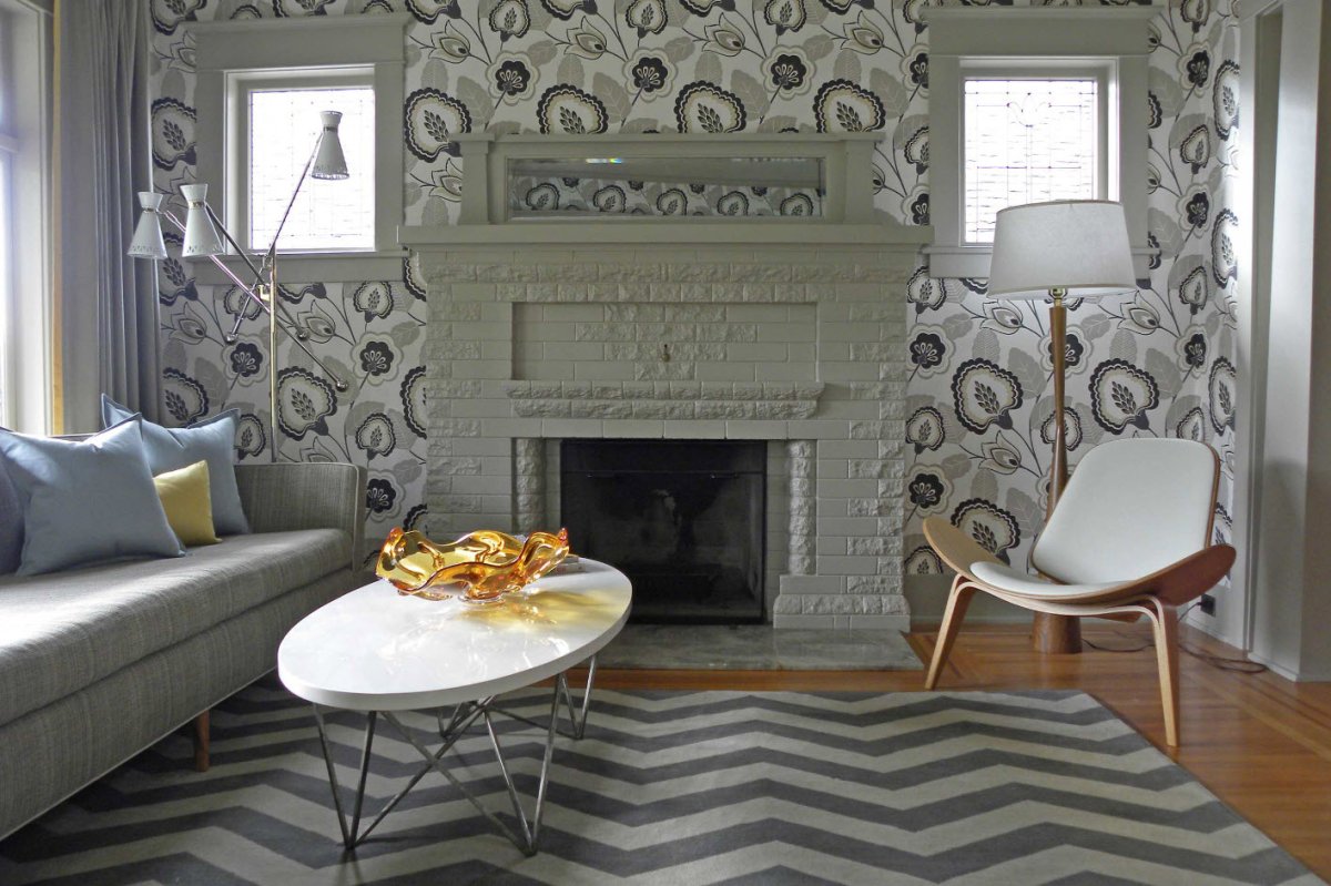 67. Комбинированные обои в гостиной с камином