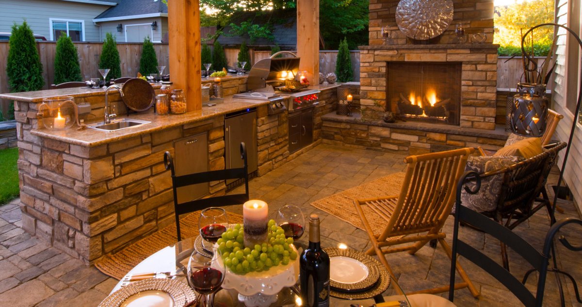 Не пропустите фото ниже, чтобы увидеть, как великолепно выглядит наша летняя кухня с камином.