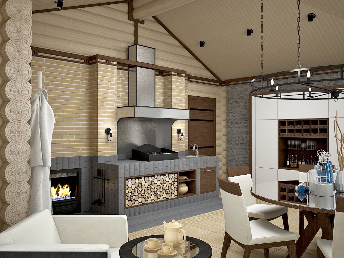 54. Кухня гостиная с зоной барбекю